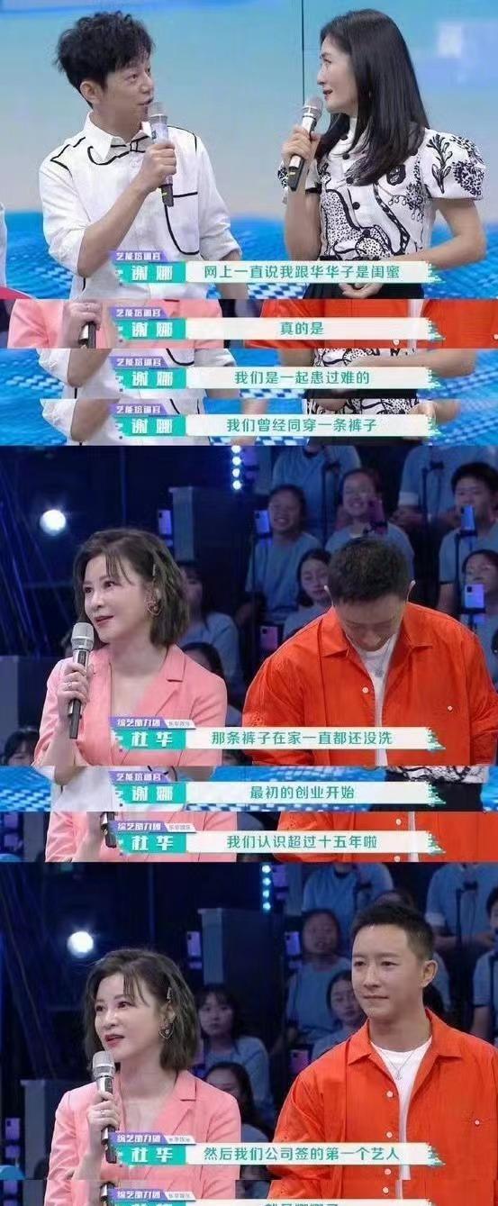 2020年8月两人在《快乐大本营》同台,首次公开“共患难”往事。杜华携乐华艺人做客《快本》,谢娜当众承认:“我们是真闺蜜,一起穿过同一条裤子。”杜华接话称:“那条裤子我至今没洗。”此番互动引爆网络,坐实了两人“铁闺蜜”身份。也是在此期间,杜华首度透露:“我签的第一个艺人就是谢娜。”