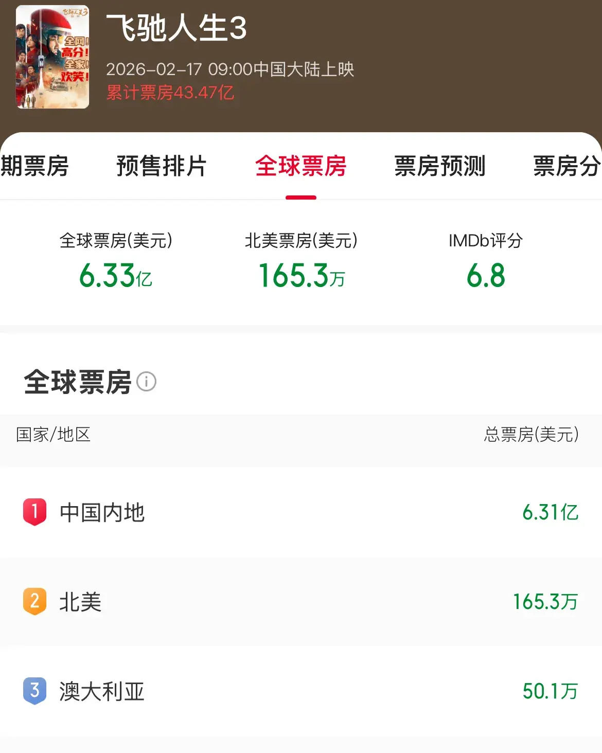 先说说眼下还坐在全球票房冠军宝座上的《飞驰人生3》,沈腾一出手果然不一样,这部电影直接拿下6.31亿美元的全球票房,暂时稳坐第一,看着确实风光无限。