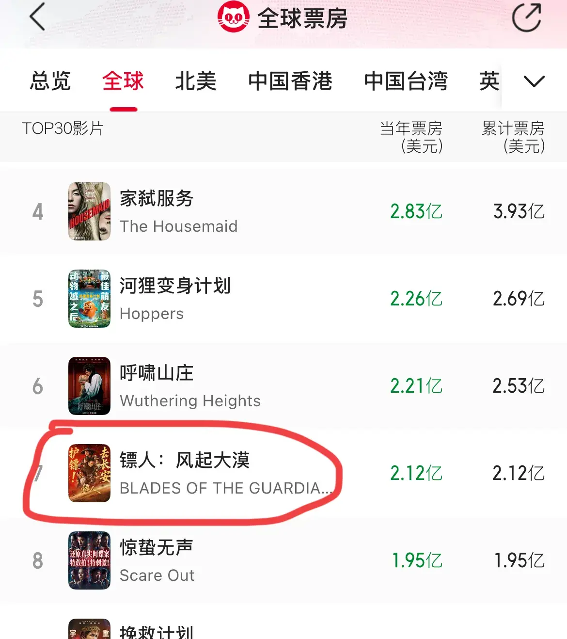 说起来《镖人》真的挺可惜,被不少网友夸是新世纪最牛的国产武侠大片,口碑比《飞驰人生3》好,海外票房也更能打,可偏偏在内地市场没打过《飞驰人生3》,票房差了一大截。也正因为这样,它在全球票房榜的排名一直不算靠前,之前还在第六,现在已经掉到第七了,用不了几天,铁定还要跌到第八。