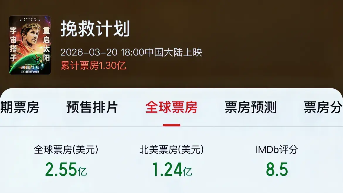 照这个趋势走下去,《挽救计划》在内地最终票房破2亿,根本就是轻轻松松的事。而且不光内地卖座,它在北美和其他海外市场也火得一塌糊涂,全球票房加起来,现在已经快到2亿美元了,再过不久就能突破2.2亿,最终冲到3亿都有可能。