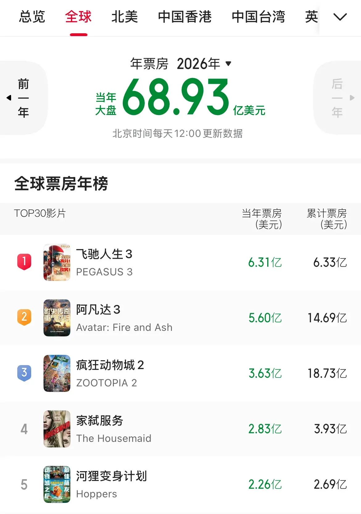 2026年全球年度电影票房榜,现在已经乱成一锅粥了!之前靠着国产大片撑起来的前排位置,现在正被好莱坞大片疯狂冲击,沈腾主演的《飞驰人生3》、吴京谢霆锋联手的《镖人》,全都顶不住,排名眼看着就要一路往下掉!