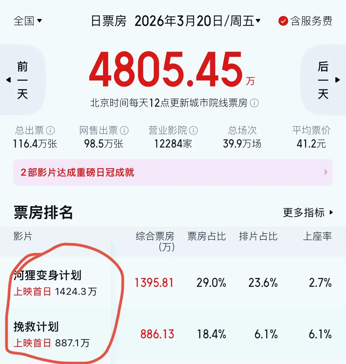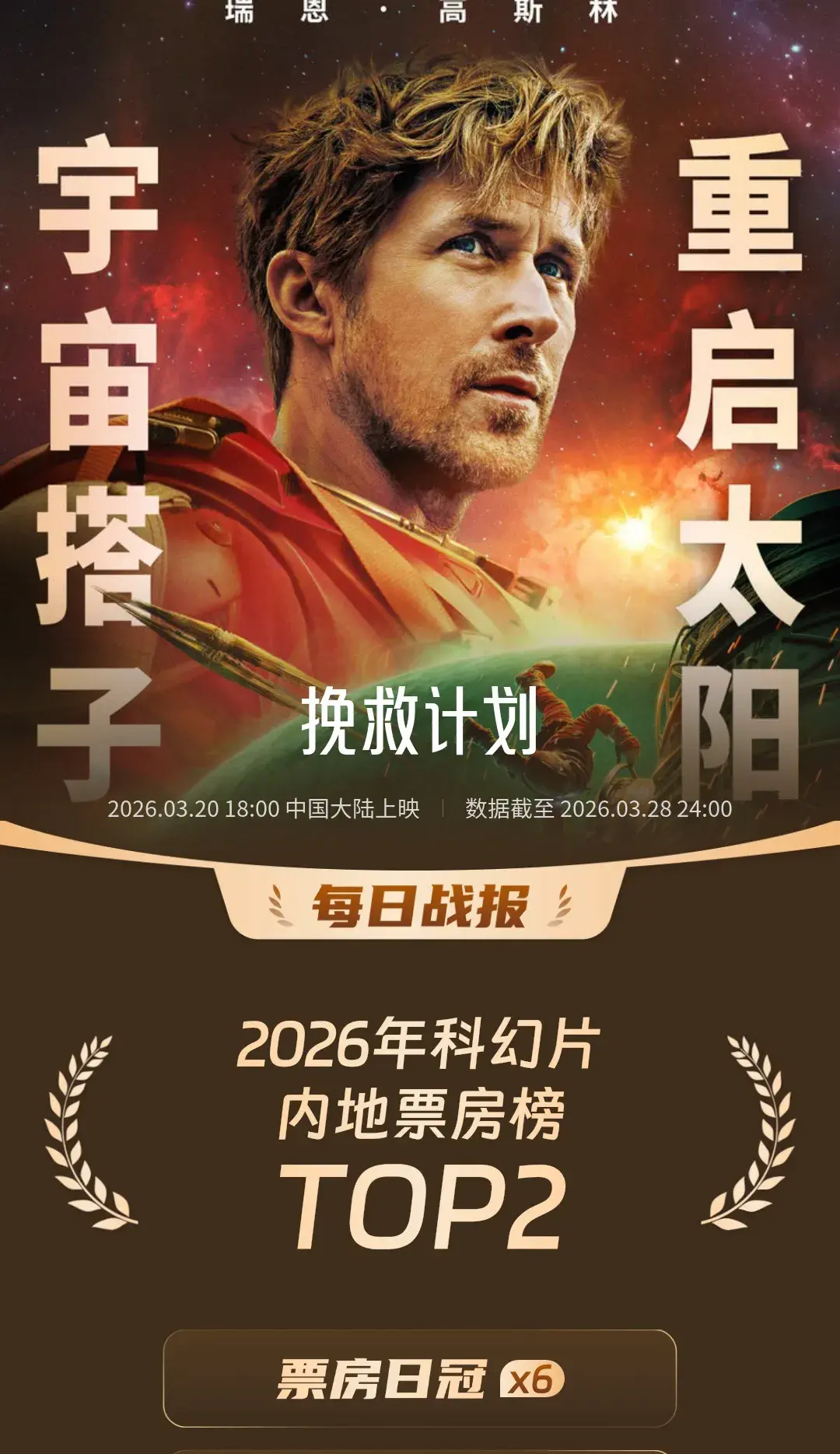 靠着这么好的口碑,《挽救计划》的票房后劲直接拉满,一路狂飙。上映第一天,它就拿了近900万人民币票房,当天只比迪士尼的《河狸变身计划》差一点,排了日票房第二。