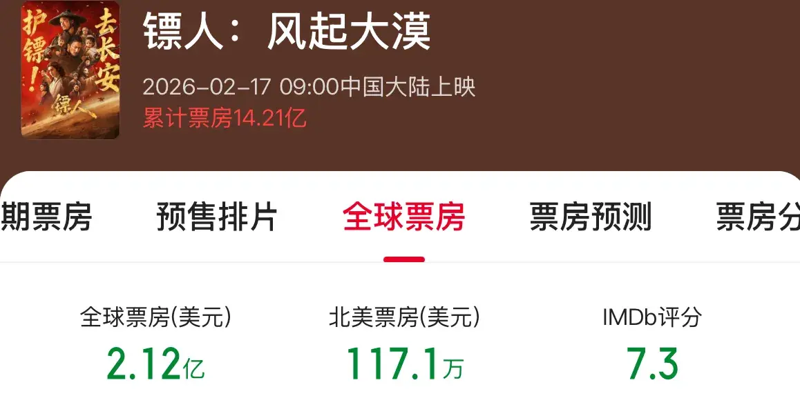 再看看《镖人》,现在全球总票房才2.11亿美元,比《挽救计划》现在的票房都低,更别说跟它的预期票房比了。
